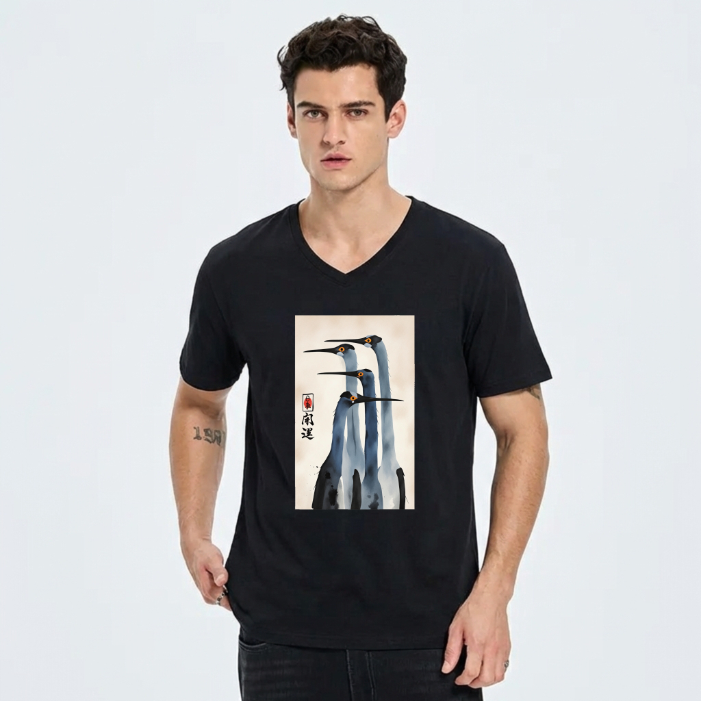 Japanese Crane Art Print T Shirt Men Women Black V Neck Casual Top