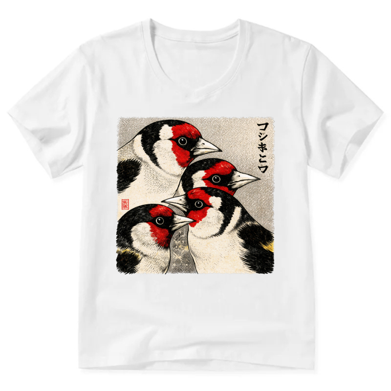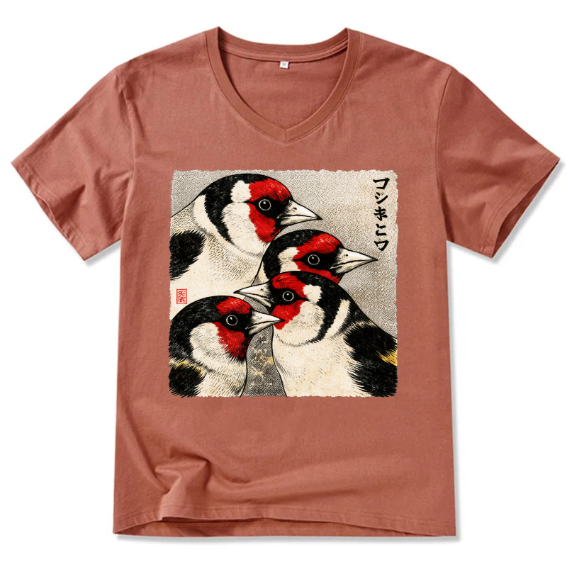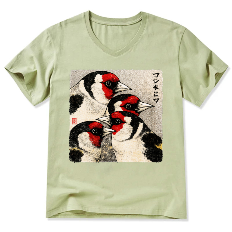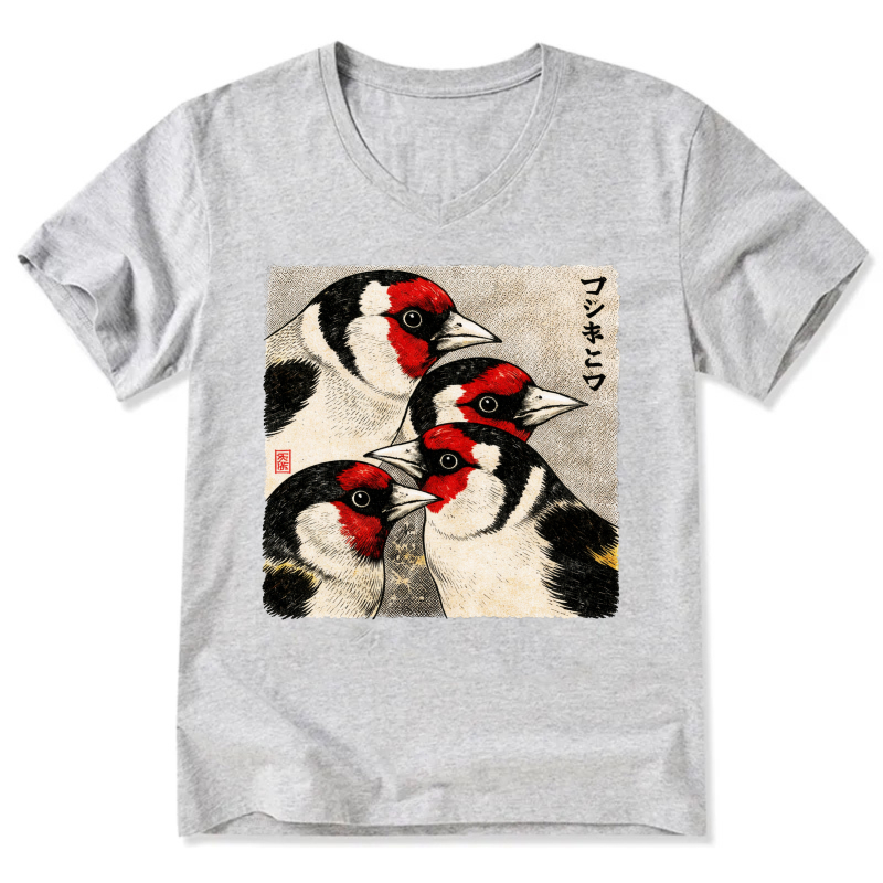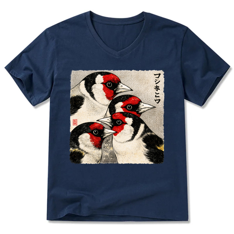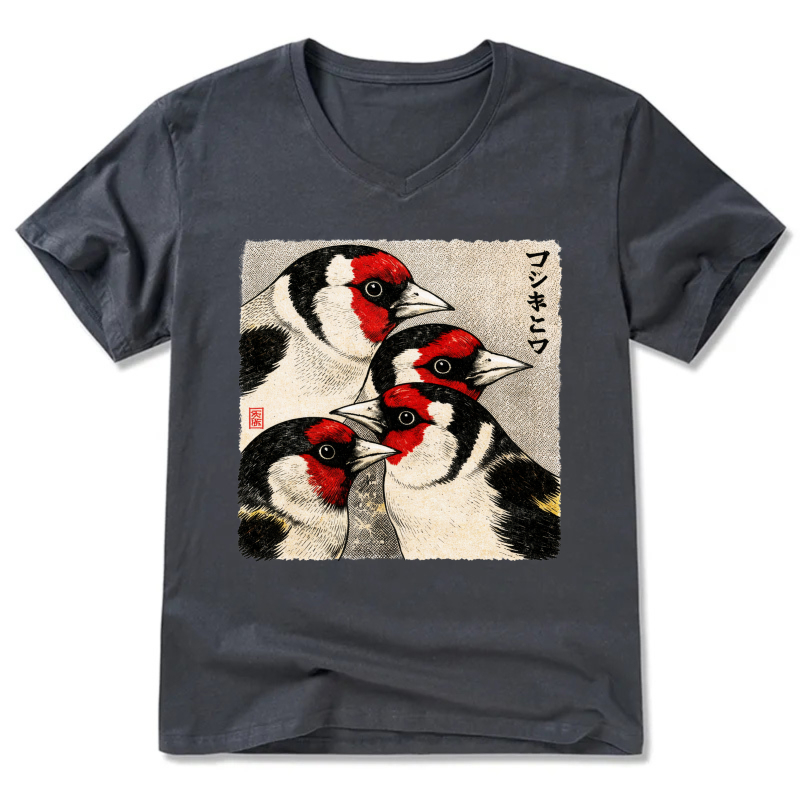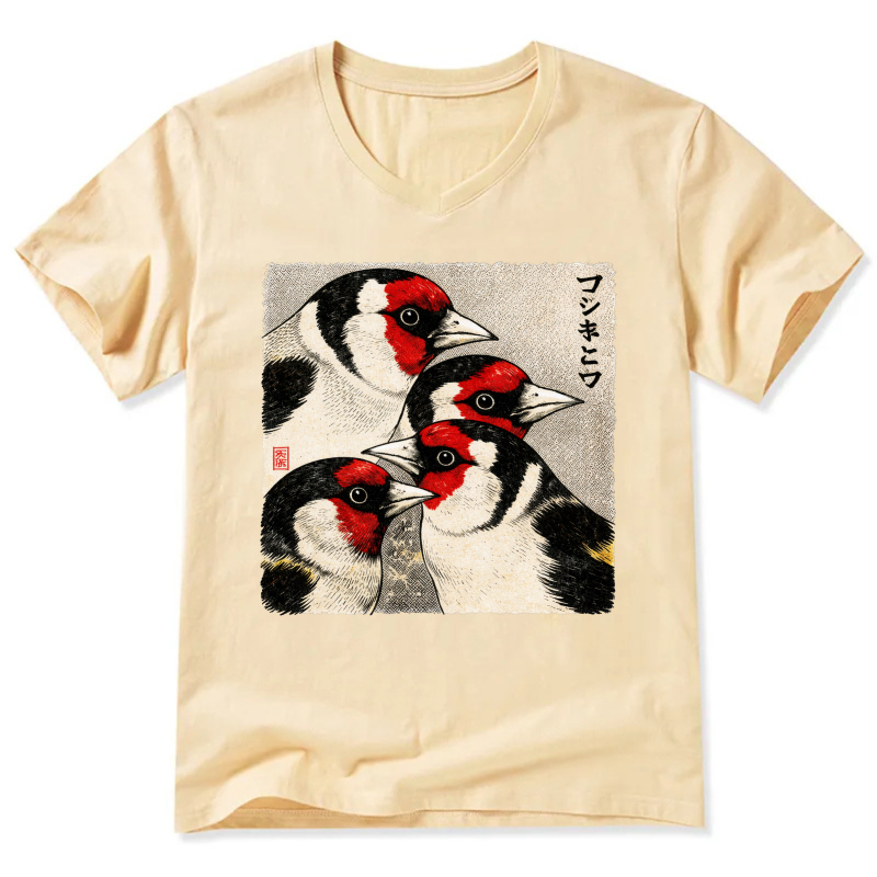 Japanese Style Goldfinch Bird Art T Shirt Men Women Black V Neck Casual Wear